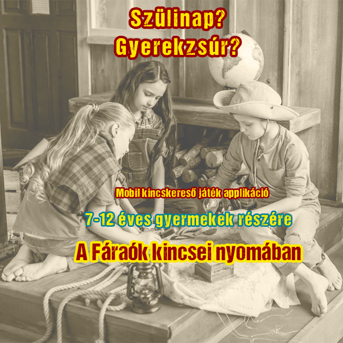 A “Fáraók kincsei nyomában” című otthoni beltéri kincskereső játékunk ideális szülinapi zsúr, és partijáték 7-8-9-10-11-12 éves korú gyerekeknek, gyermekes családok számára. Mobil eszközön futó, “nyomtass és játssz” kategóriába tartozó családi játékunk szórakoztatva tanít: